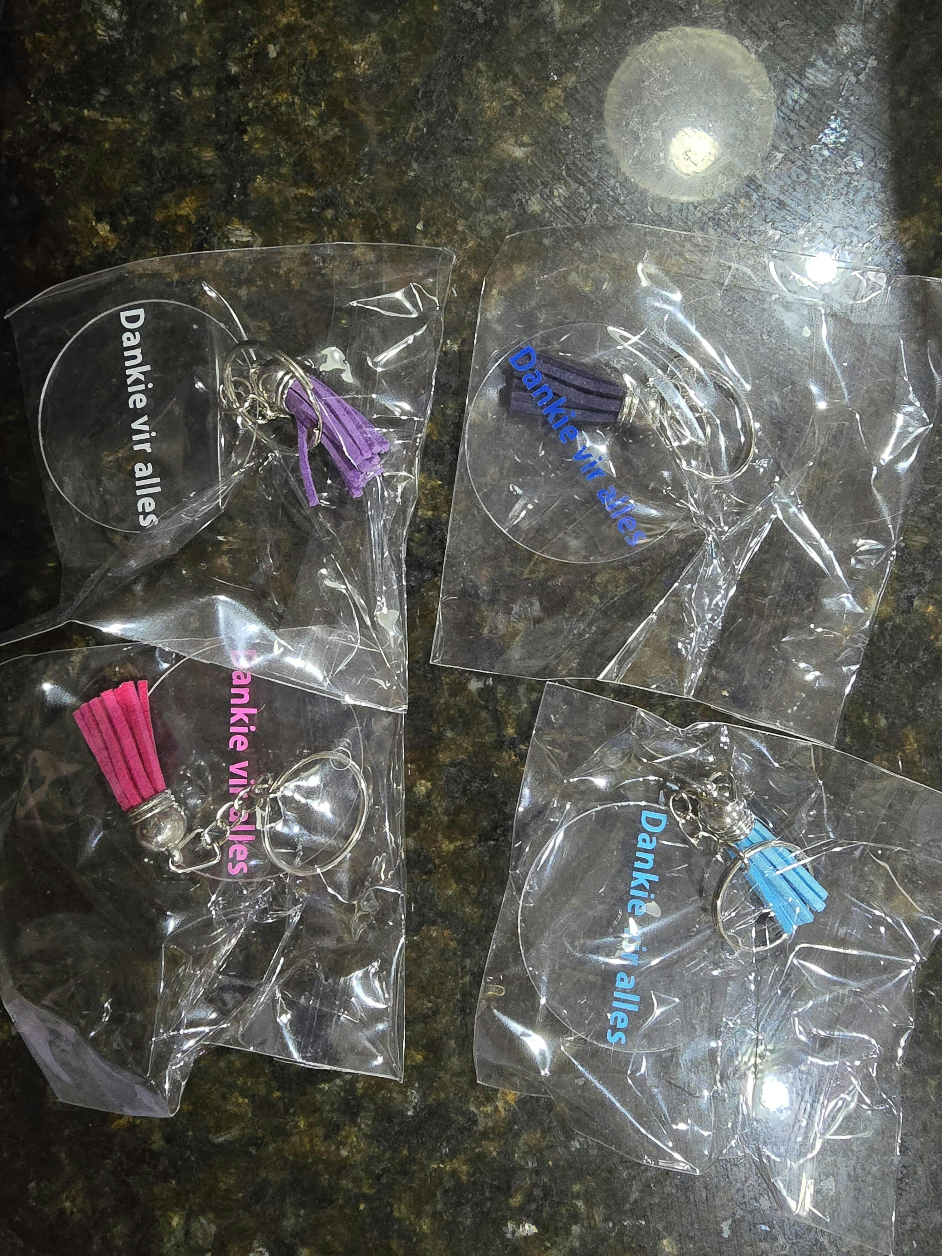 Unfortunately I did not receive what thr website advertised. When placing an order, I could only chose the recipient (I was under the impression it is the person who would receive the key chain, so I entered their names), the color, and the wording. I received plain, transparent key chains with the wording in selected colors, not with the people's respective names.